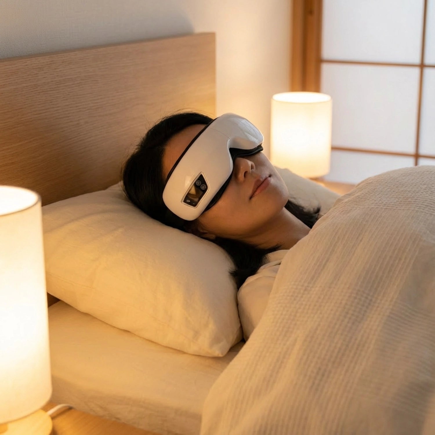 寝る15分前。目を閉じて、NightRelax Proを装着する。