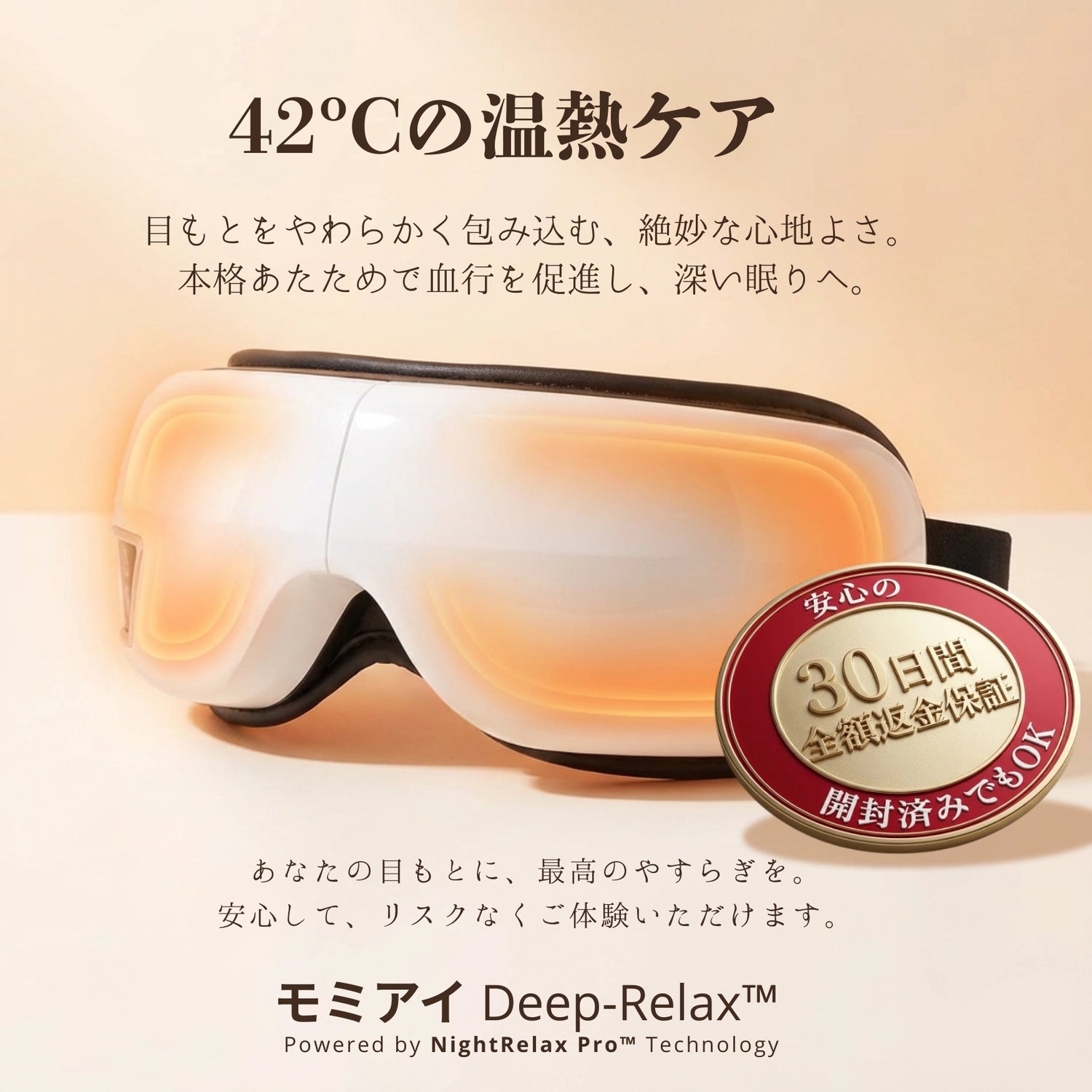 めぐりズム等の使い捨てマスクは月3,000円以上かかりますが、NightRelax Proは1日あたりわずか約20円(1年使用換算)。しかも30日間全額返金保証付きで、リスクなくお試しいただけます。