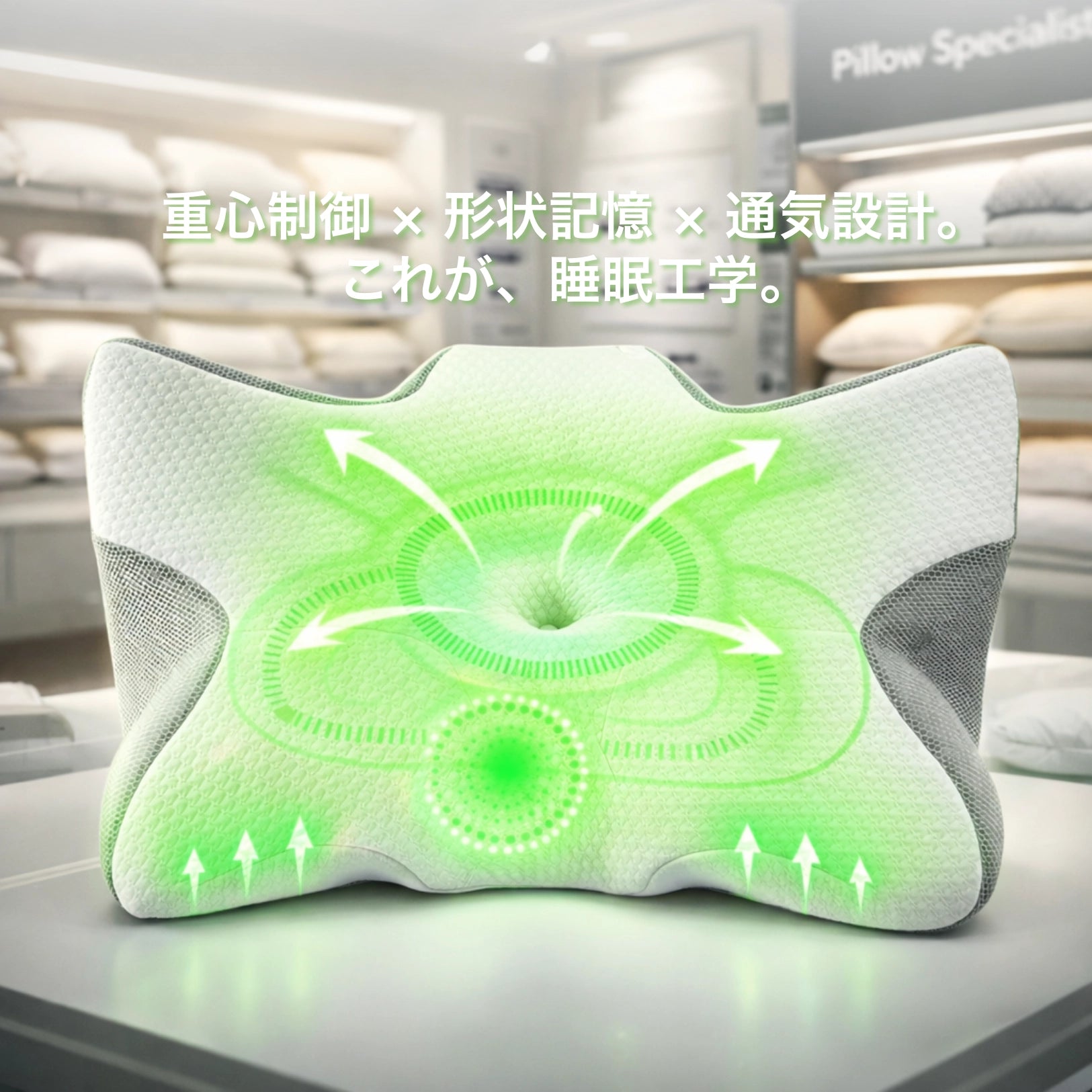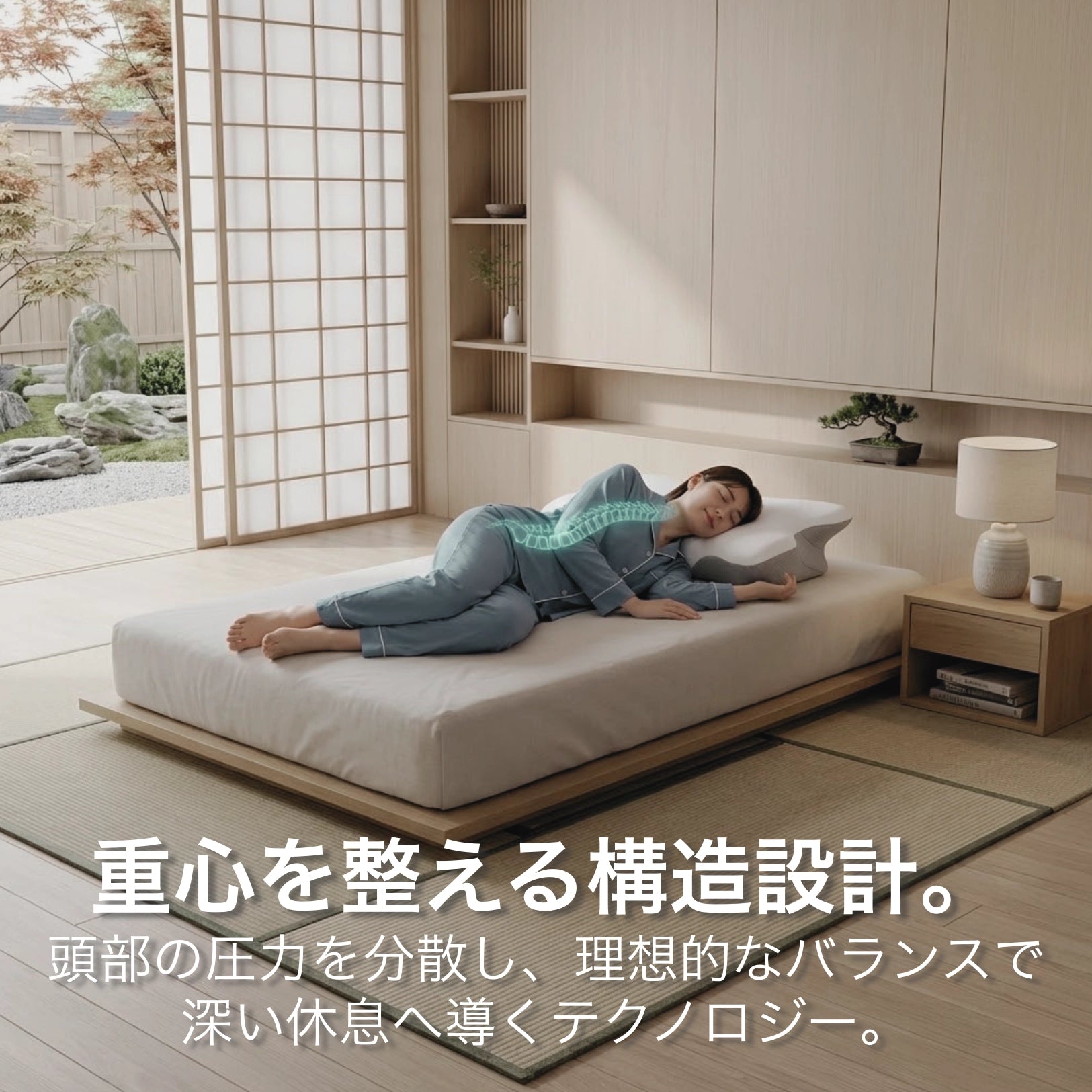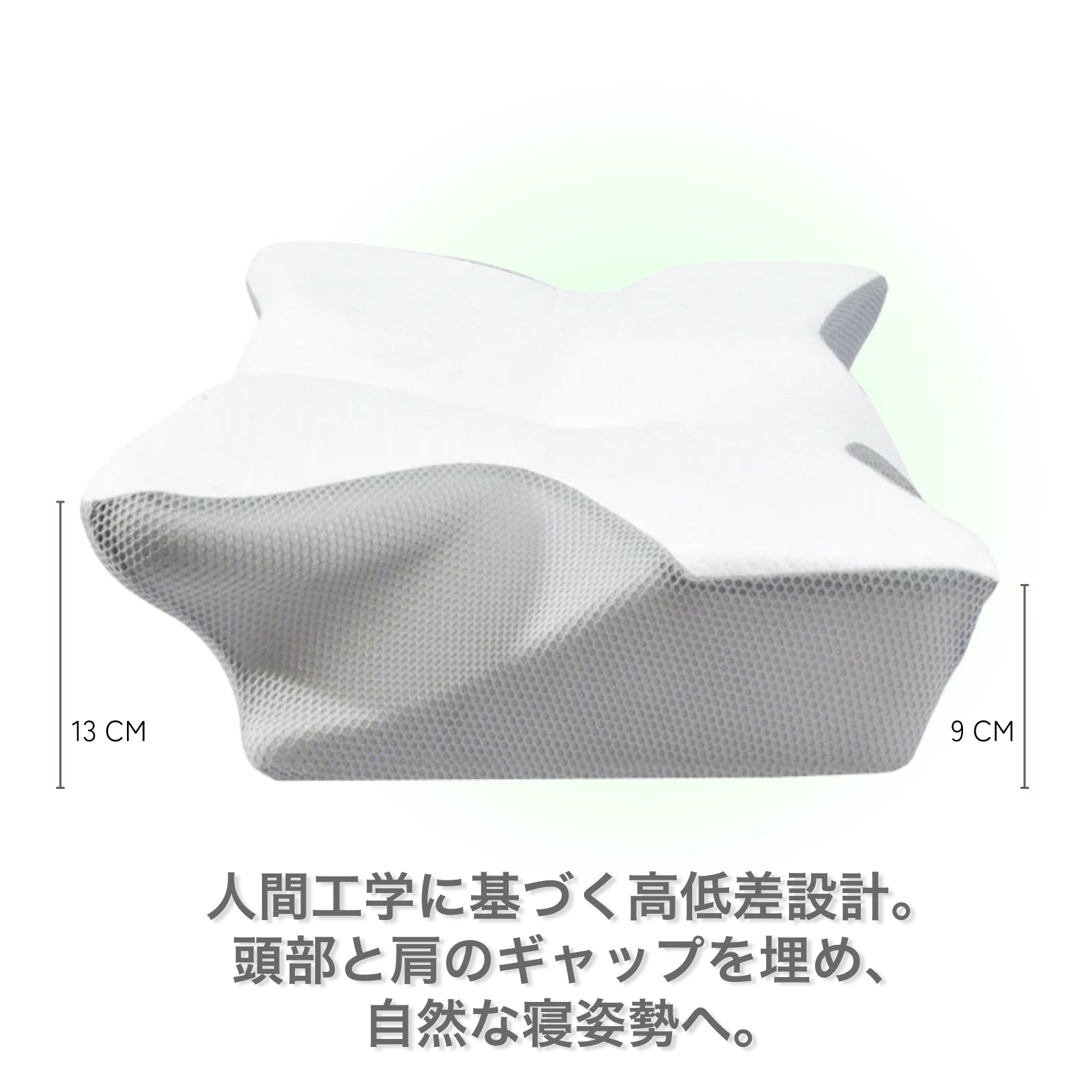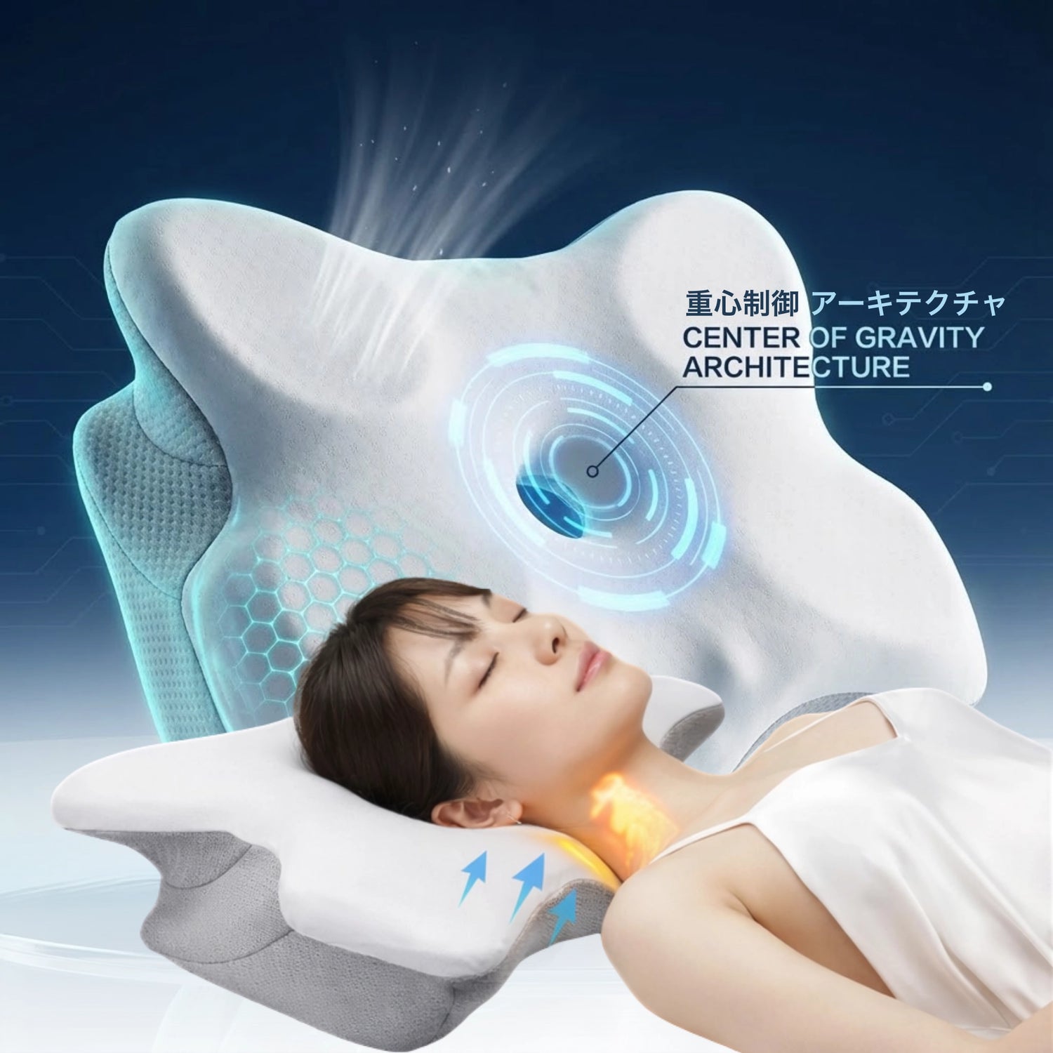 ゼロプレッシャーテクノロジーは、人間工学に基づくバタフライ形状で頚椎の自然なC字カーブを完璧にサポート。頭の重さを一点に集中させるのではなく、広い面積に均等に分散させます。