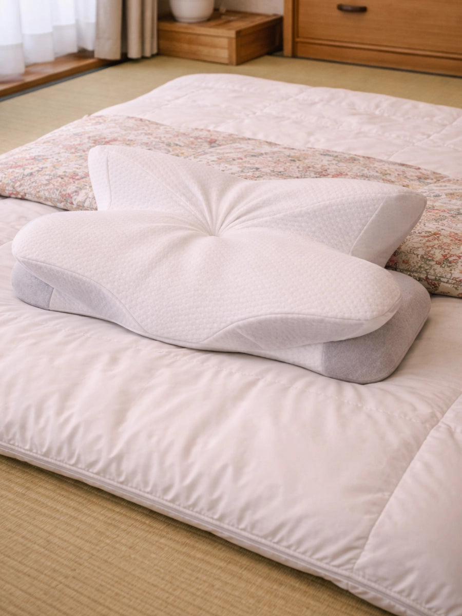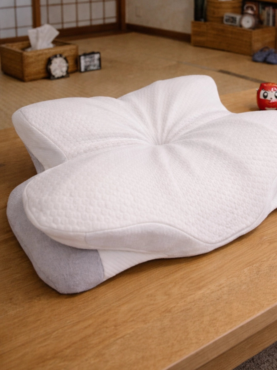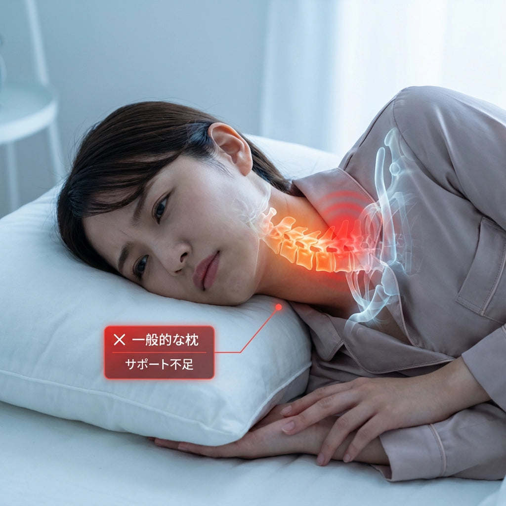 実は、問題は枕の品質ではなく形状にあるかもしれません。一般的なフラット枕は、頚椎の自然なカーブを無視して設計されています。