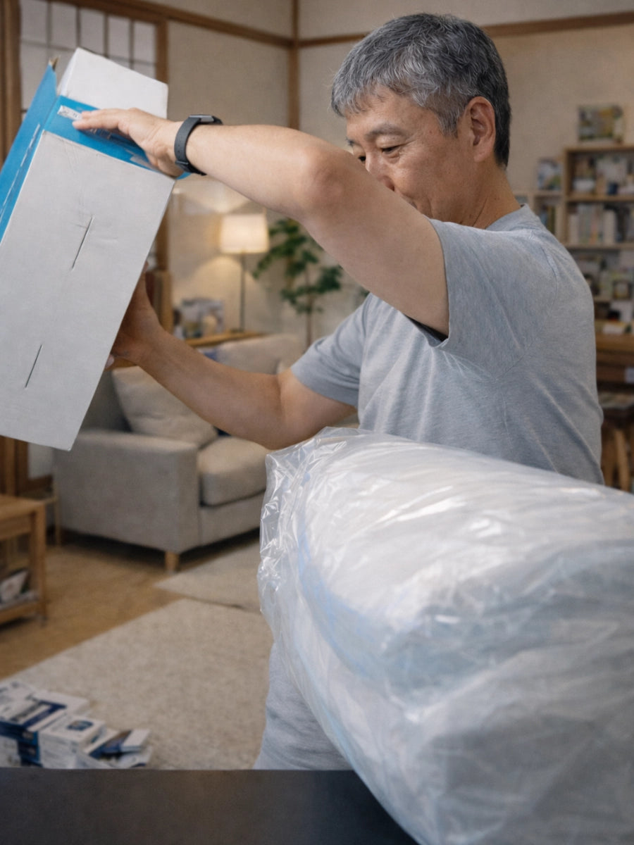 新品のメモリーフォーム特有の匂いがわずかにある場合がありますが、開封後1-2日で自然に消えます。実際のレビューでも匂いは全然気にならなかったというお声を多くいただいています。